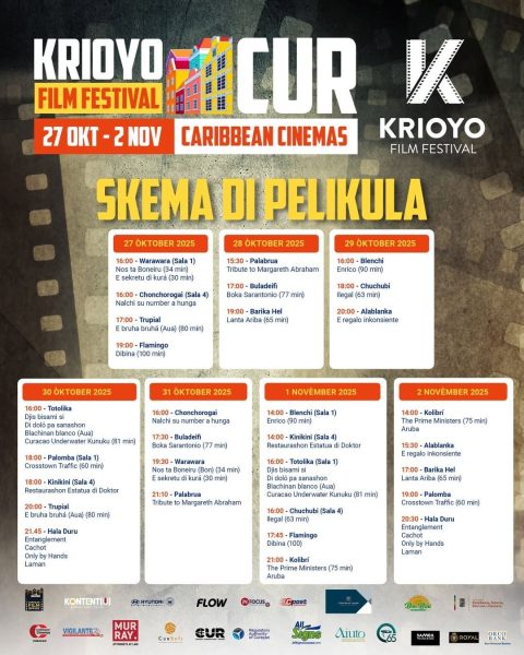 The second edition of the Krioyo Film Festival will take place from October 27 to November 2, 2025 at Caribbean Cinemas Curaçao – Sambil, Willemstad. Featuring 14 curated film blocks, new 2025 productions, and a special Nostalgia section, the festival celebrates stories in Papiamentu and from across the ABC Islands. It offers a vibrant platform for local filmmakers to showcase their creativity and for audiences to experience authentic Caribbean storytelling.